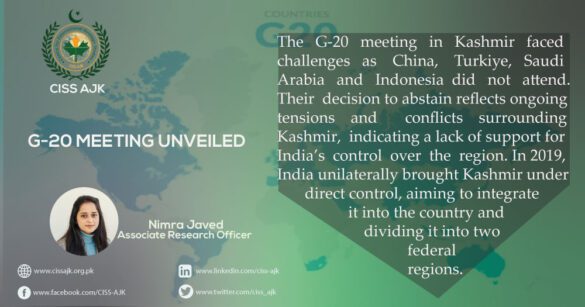 The decision to host the G-20 meeting in Kashmir was controversial, with China boycotting it due to the disputed territory and Pakistan condemning it as a military occupation. Additionally, Egypt and Indonesia also boycotted the summit. The absence of major players such as Saudi Arabia, Turkiye and China significantly diminished the impact and relevance of the G-20 Summit, compromising its overall effectiveness.