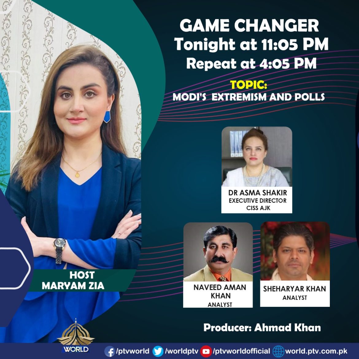 Dr. Asma Khawaja, the Executive Director of CISS AJK, engaged in a discussion as guest analyst on PTV World’s News Room program with Anchor Omar Khalid Butt on 19 April, 2024, focusing on Indian Elections and Concerns related to it.