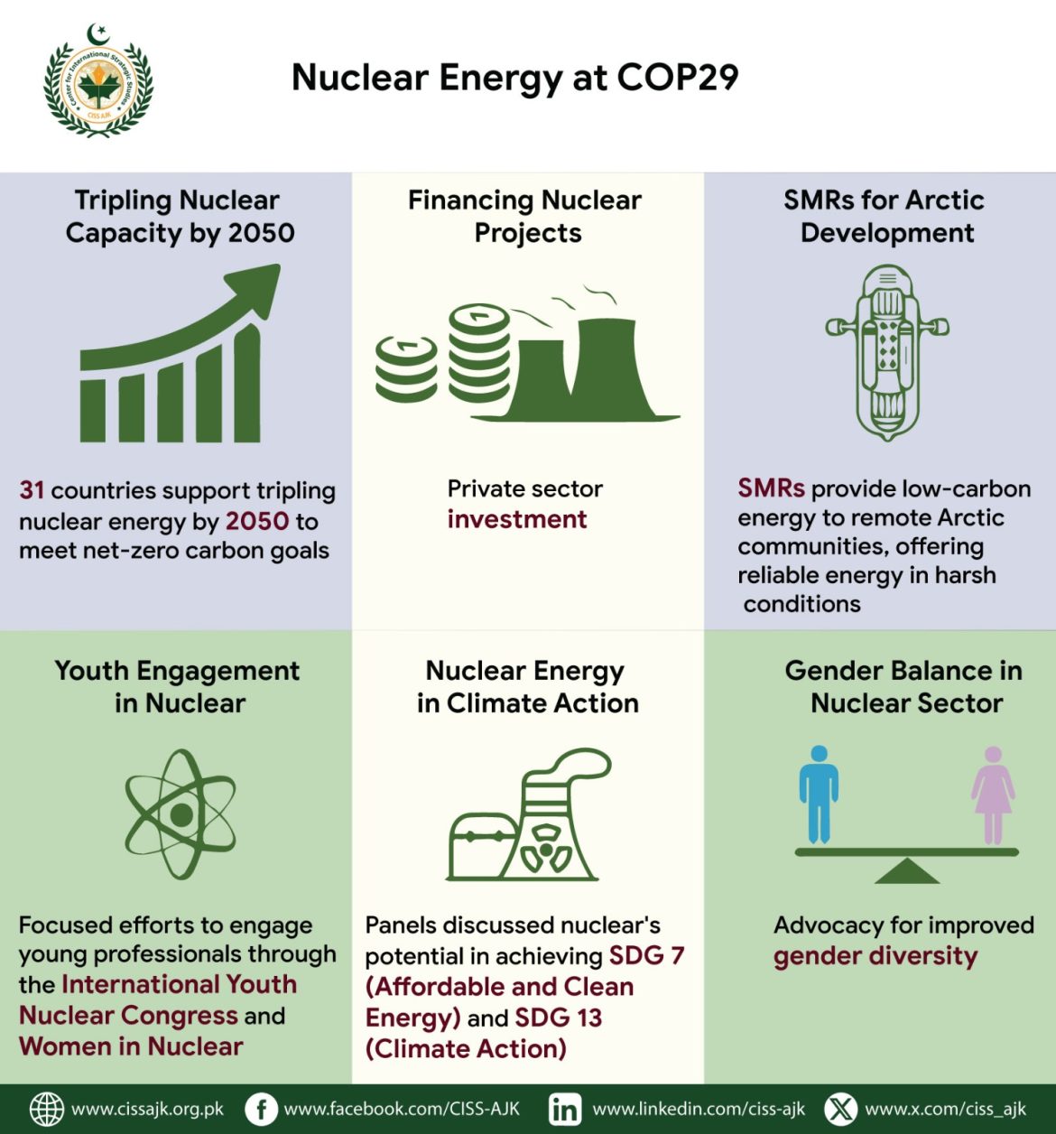 World leaders at COP29 agreed to triple nuclear energy by 2050 for net-zero goals, with private investment driving projects. Small Modular Reactors (SMRs) were highlighted as ideal for remote areas like the Arctic. Youth engagement and gender diversity were emphasized to build a strong nuclear workforce. Nuclear energy’s role in clean energy (SDG 7) and climate action (SDG 13) was a key focus.