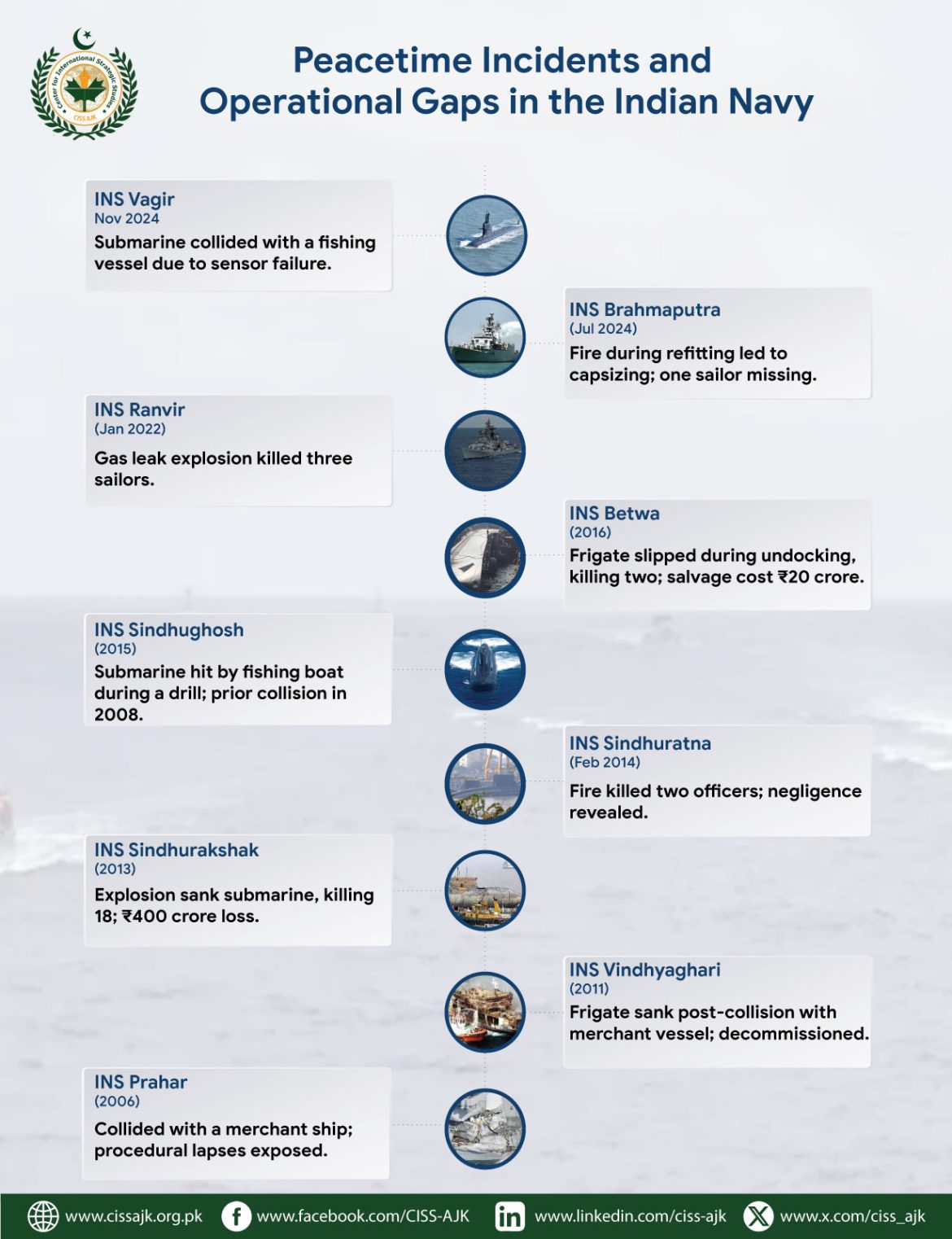 The naval mishaps faced by Indian navy questioned its professionalism, as most of these peacetime military losses reveal sheer negligence. Despite expert recommendations and corrective steps being offered by many audit findings and recommendations, Indian navy failed to avoid such incidents from happening. The peacetime military losses raise questions on the capacity of Indian navy to stand in a battlefield and their ability to manage sophisticated technologies, such as nuclear submarines, without jeopardizing regional security.