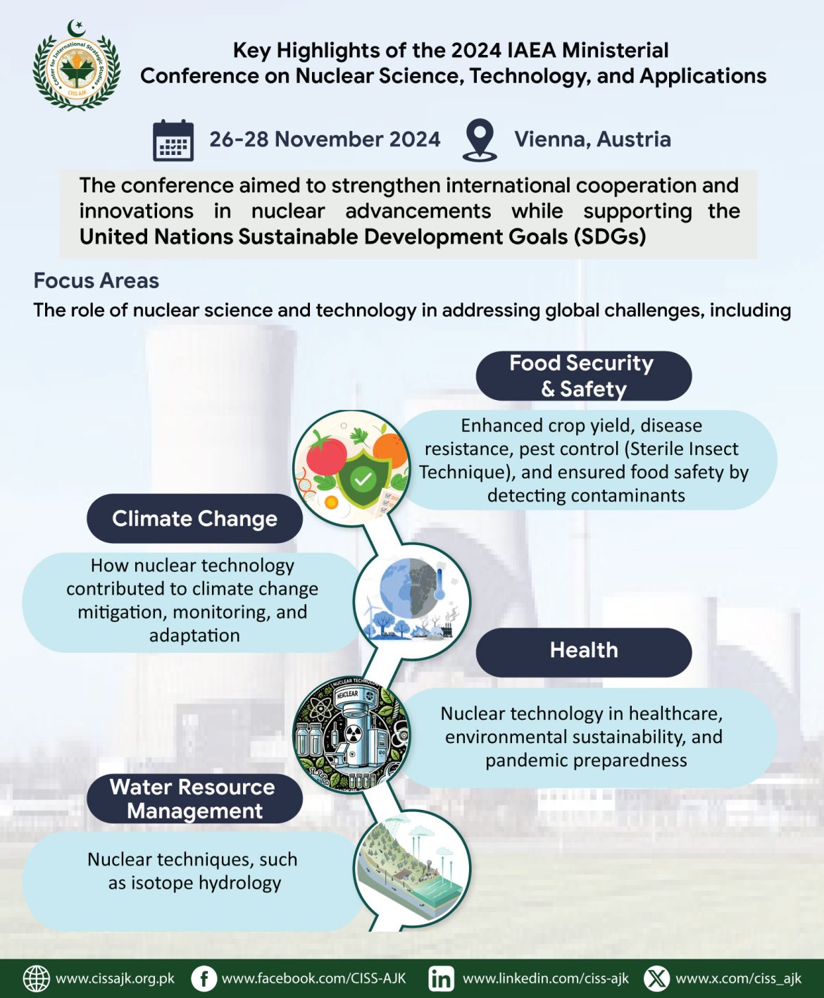 This infographic highlights the key takeaways from the 2024 IAEA Ministerial Conference, showcasing the vital role of nuclear science and technology in tackling global challenges and supporting the United Nations Sustainable Development Goals (SDGs). The focus areas included food security, climate change mitigation, healthcare advancements, and water management, emphasizing nuclear energy’s potential to drive sustainable development across various sectors.