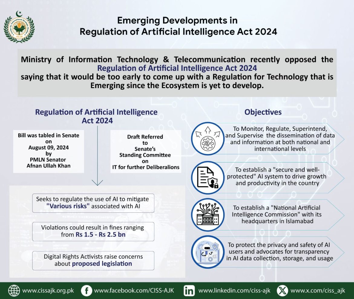 This infographic highlights the recent developments happened in context of the Bill tabled in Senate on the Regulation of Artificial Intelligence Act 2024. The act was proposed on 9th August, 2024 & the Draft was referred to Senate’s Standing Committee on IT for further deliberations. Recently, the Minsitry of IT & Telecom opposed the Regulation of AI Act by saying that it is too early to come up with a regulation for a technology that is emerging since the ecosystem is yet to develop.