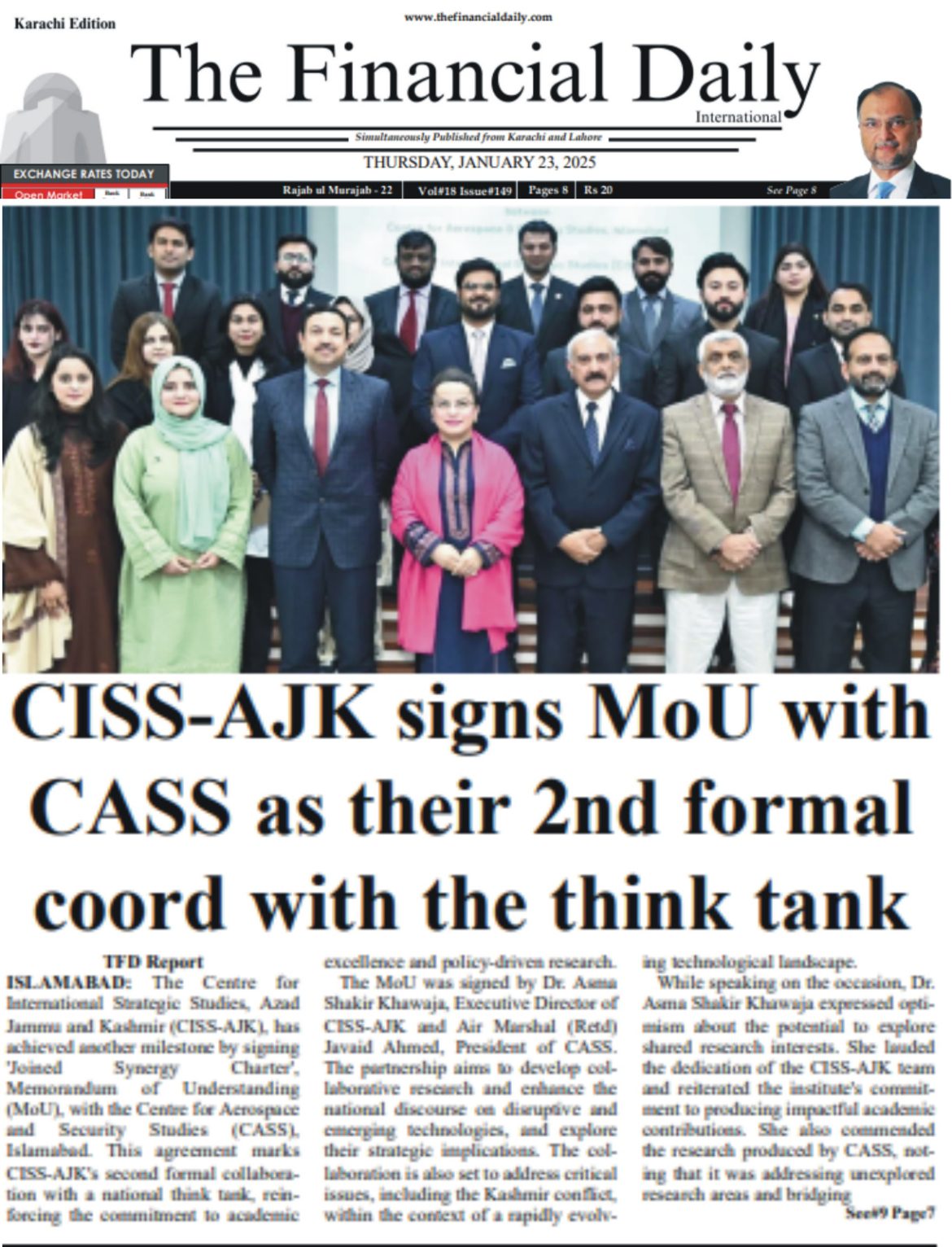 Center for International Strategic Studies Azad Jammu and Kashmir was established in Muzaffarabad on November 01, 2022. It is an autonomous, non-profit, non-partisan and multidisciplinary Research Center with a focus not limited to Kashmir only, but the regional and global dynamics influencing Pakistan.