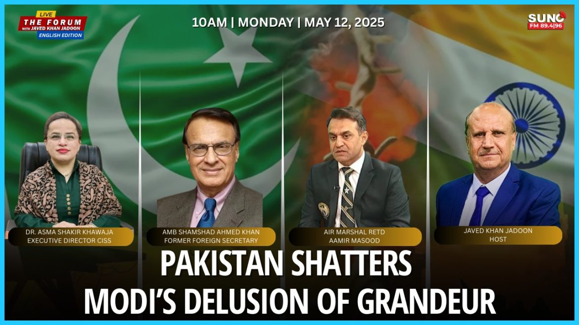 | 12 May 2025, Dr. Asma Khawaja participated in “The Forum,” a program broadcast by Suno FM Network and Radio Pakistan’s MW Network, hosted by Director News & Current Affairs, Javed Khan Jadoon. The discussion focused on the topic: “India Blinked: Pakistan’s Use of Superior Air Power, Surface-to-Surface Missiles, and Drones with Cutting-Edge Technologies Shattered Modi’s Delusion of Grandeur. |