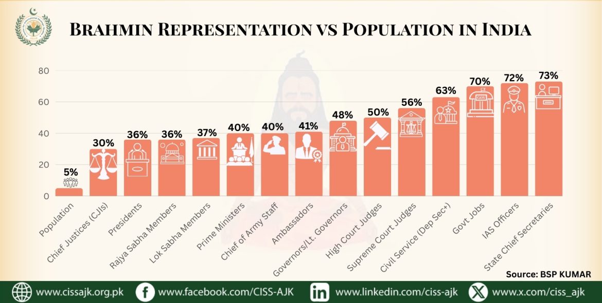 The infographic illustrates the stark contrast between the Brahmin community’s proportion of India’s population and their overwhelming dominance in key political, judicial, and bureaucratic institutions.