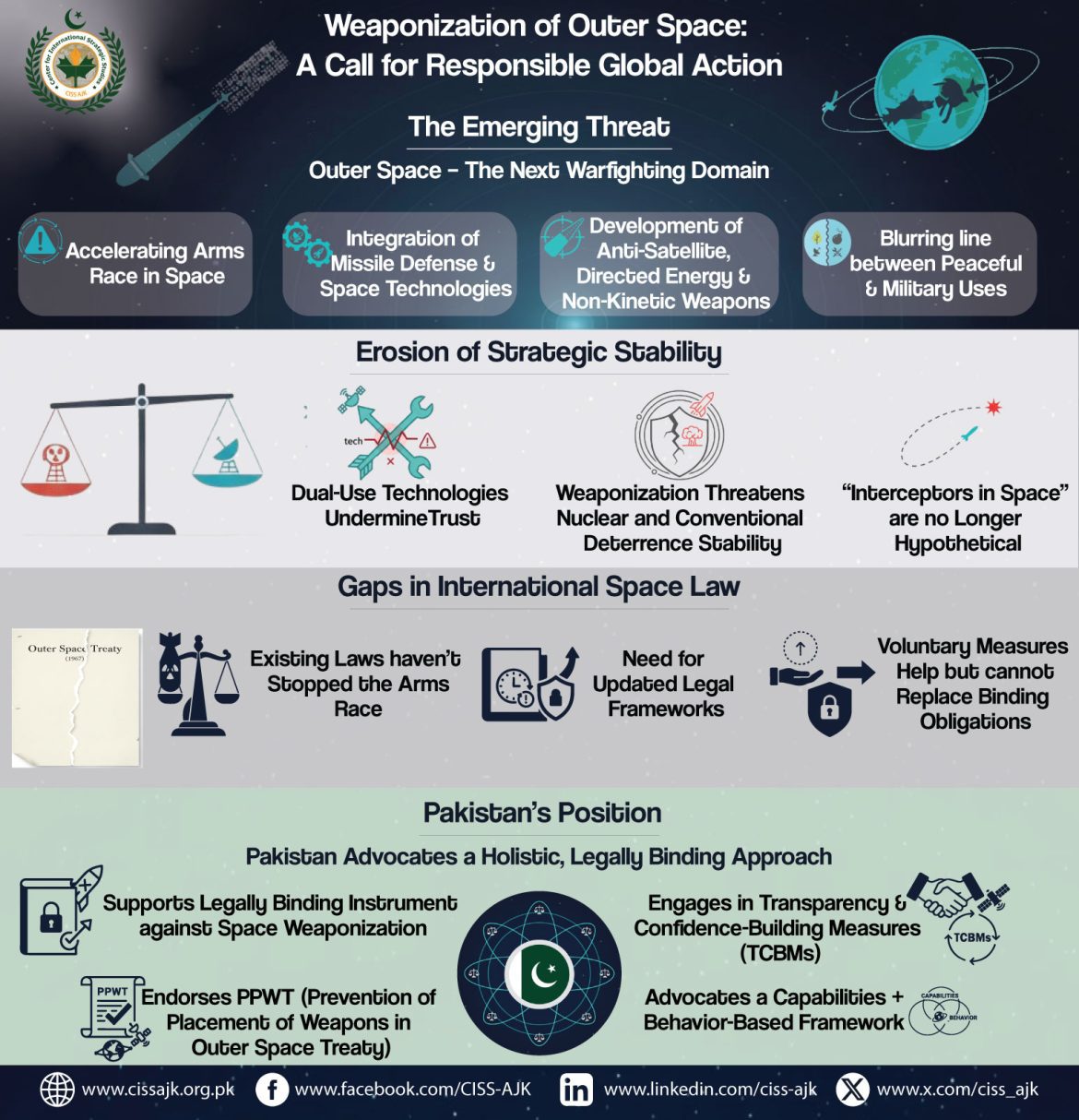This infographic highlights Pakistan’s statement at the UNGA on the weaponization of outer space. It warns of an acceleration in arms race and erosion of strategic stability due to dual-use and anti-satellite technologies. Pakistan calls for a legally binding global framework, endorsing the PPWT and promoting transparency and confidence-building measures. It urges urgent international cooperation through PAROS to preserve space for peaceful purposes.