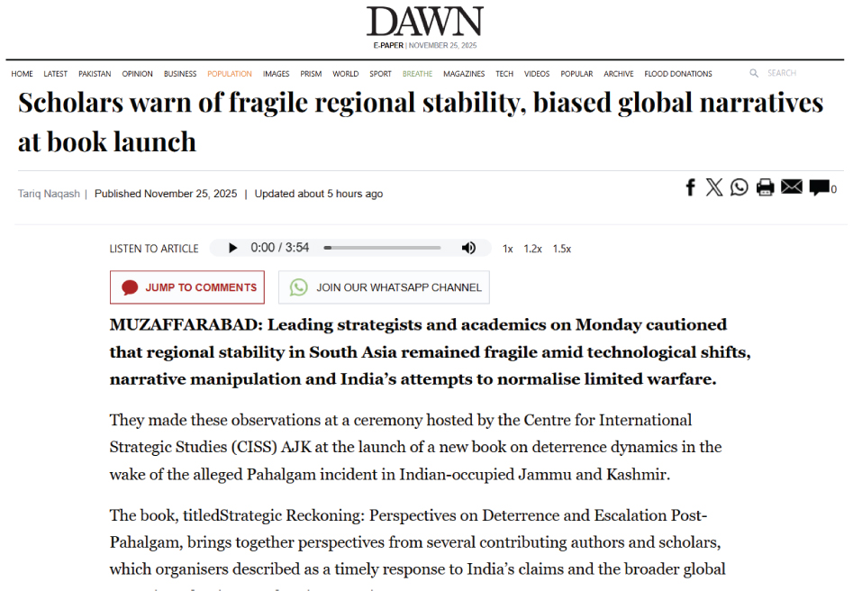 Center for International Strategic Studies Azad Jammu and Kashmir was established in Muzaffarabad on November 01, 2022. It is an autonomous, non-profit, non-partisan and multidisciplinary Research Center with a focus not limited to Kashmir only, but the regional and global dynamics influencing Pakistan.