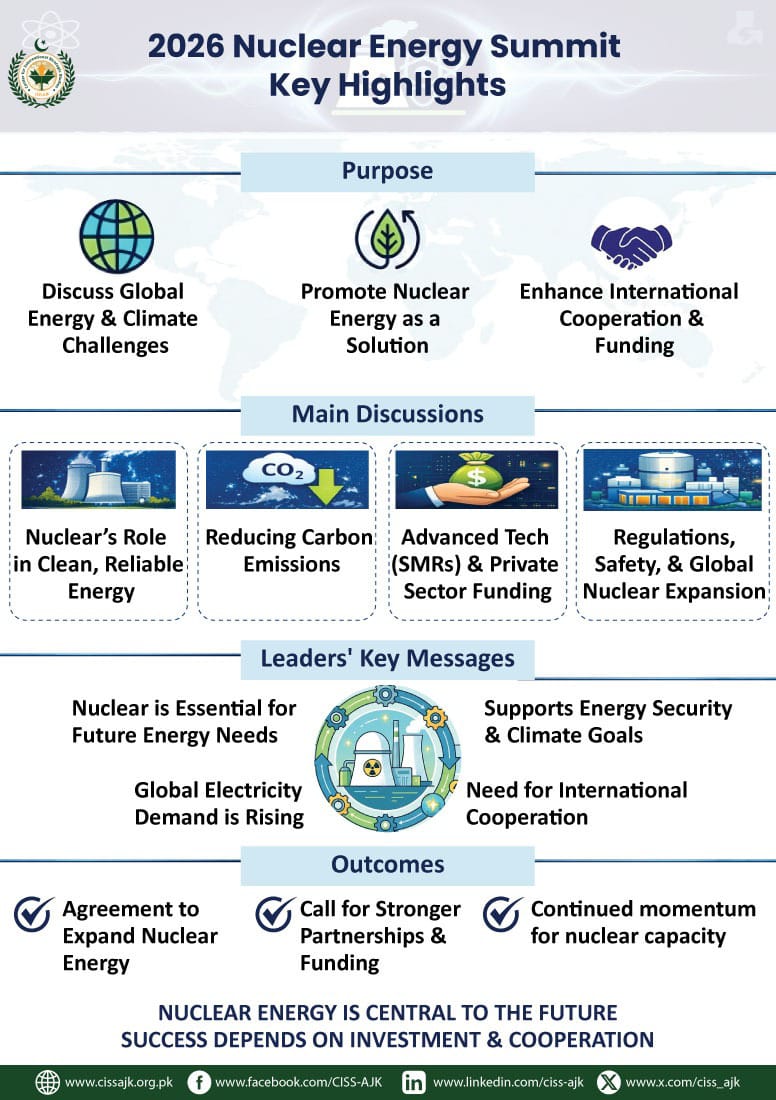 This infographic highlights the 2026 Nuclear Energy Summit focused on global energy and climate challenges, promoting nuclear as a solution. Key discussions covered nuclear’s role in clean energy, reducing carbon emissions, and the potential of SMRs with private funding.
