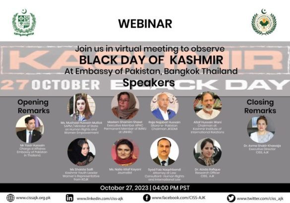 CISS AJK organized a collaborative webinar alongside the Embassy of Thailand to mark the commemoration of Kashmir’s Black Day on October 27, 2023. The event was structured to provide a comprehensive understanding of the historical significance associated with this day in Kashmir’s history.The inaugural remarks were delivered by Mr. Yasir Hussain, the Charge D’Affairs at the Embassy of Pakistan in Thailand. His insights set the tone for the discussions, emphasizing the cultural and historical importance of observing October 27th in the context of Kashmir’s narrative.