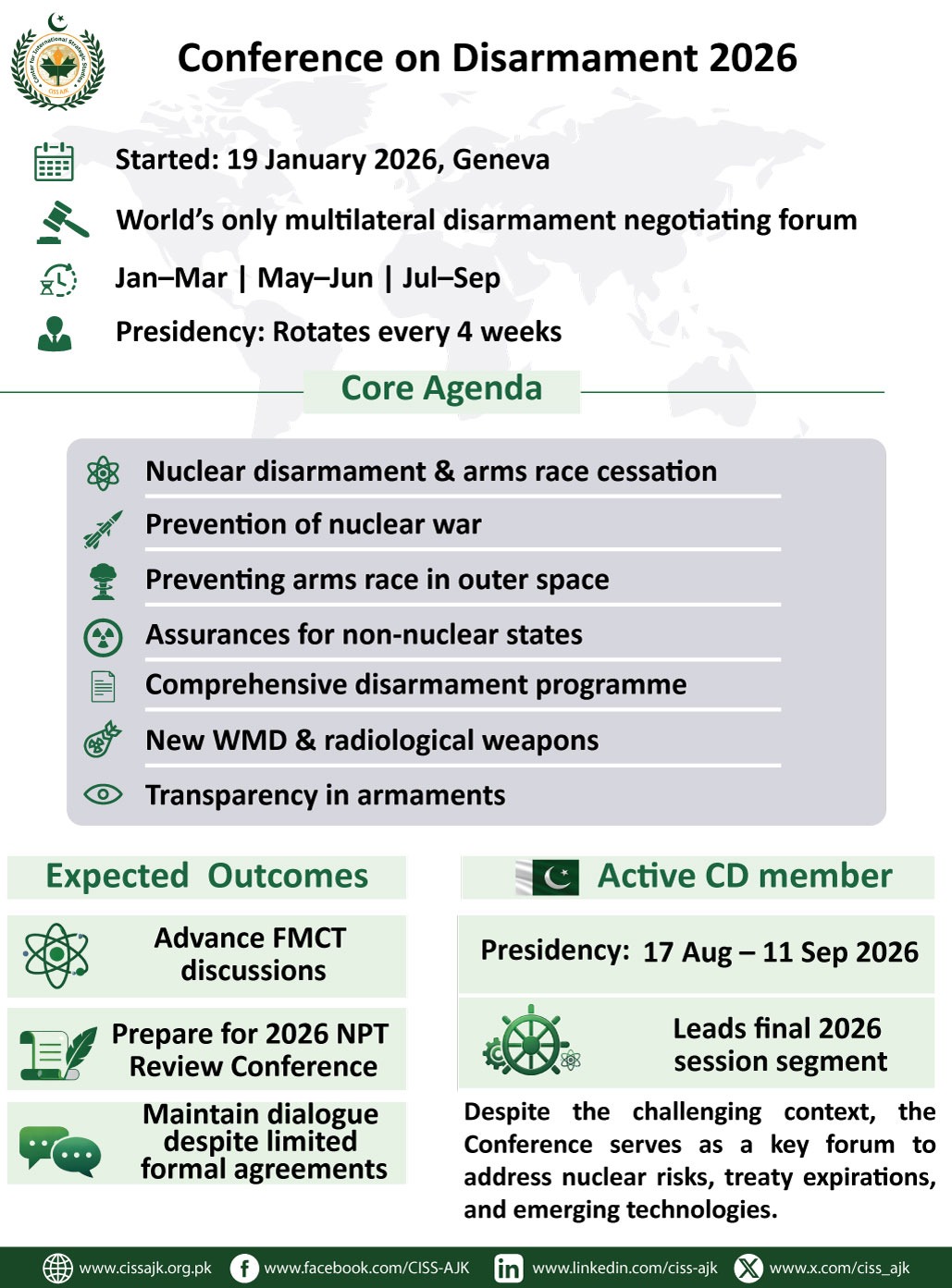 This infographic highlights the structure, core agenda, and key focus areas of the 2026 Conference on Disarmament, emphasizing Pakistan’s active role as the presiding member of the final segment.