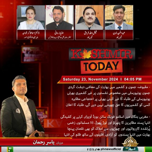 Dr. Asma Shakir Khawaja was invited as a guest analyst on PTV News’ show Kashmir Today. During the discussion she highlighted India’s blatant encroachment on the democratic rights of indigenous Kashmiris by enrolling non-Kashmiris at Jammu University in Indian Illegally Occupied Jammu and Kashmir has sparked outrage among the Kashmiris. The move has ignited protests, with resolute Kashmiri students declaring that they will not allow their rights to be taken away by anyone (India).