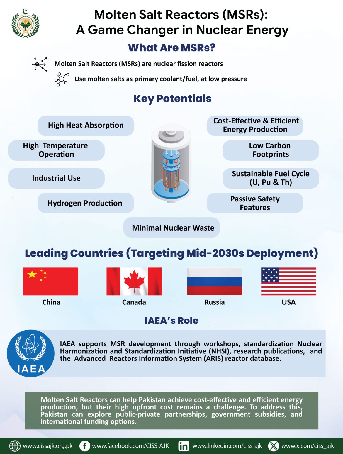 Pakistan can achieve cost-effective and efficient energy production through Molten Salt Reactors, but high upfront costs remain a barrier. Exploring partnerships, subsidies, and international funding can help overcome this obstacle.