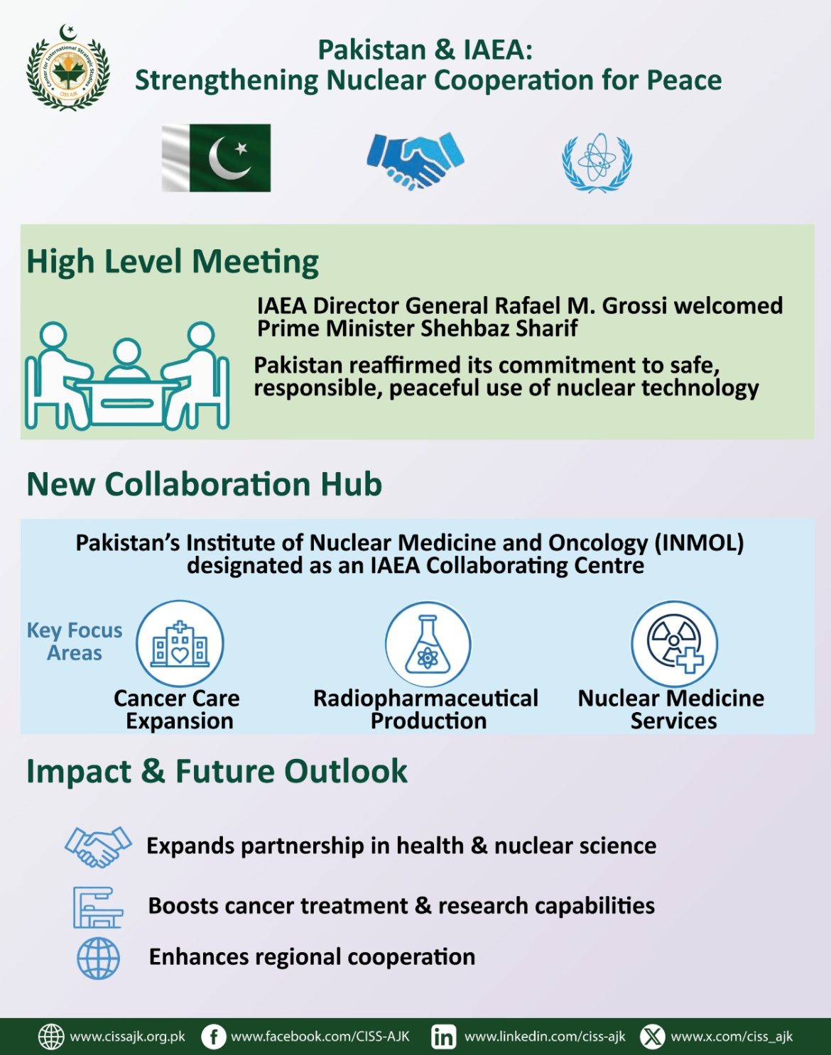 The engagement supports expanded collaboration in health, nuclear medicine, and cancer care, highlighting Pakistan’s role as a responsible nuclear state.