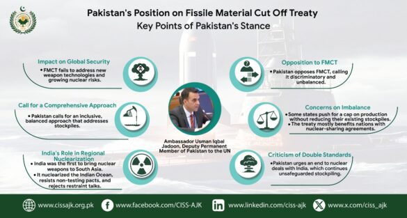 Ambassador Usman Iqbal Jadoon, Pakistan’s Deputy Permanent Representative to the UN, addressed the General Assembly on disarmament, opposing the Fissile Material Cut-off Treaty (FMCT). He criticized it as discriminatory, as it overlooks existing fissile stockpiles and benefits states with surpluses. Jadoon called for an inclusive approach to nuclear disarmament.