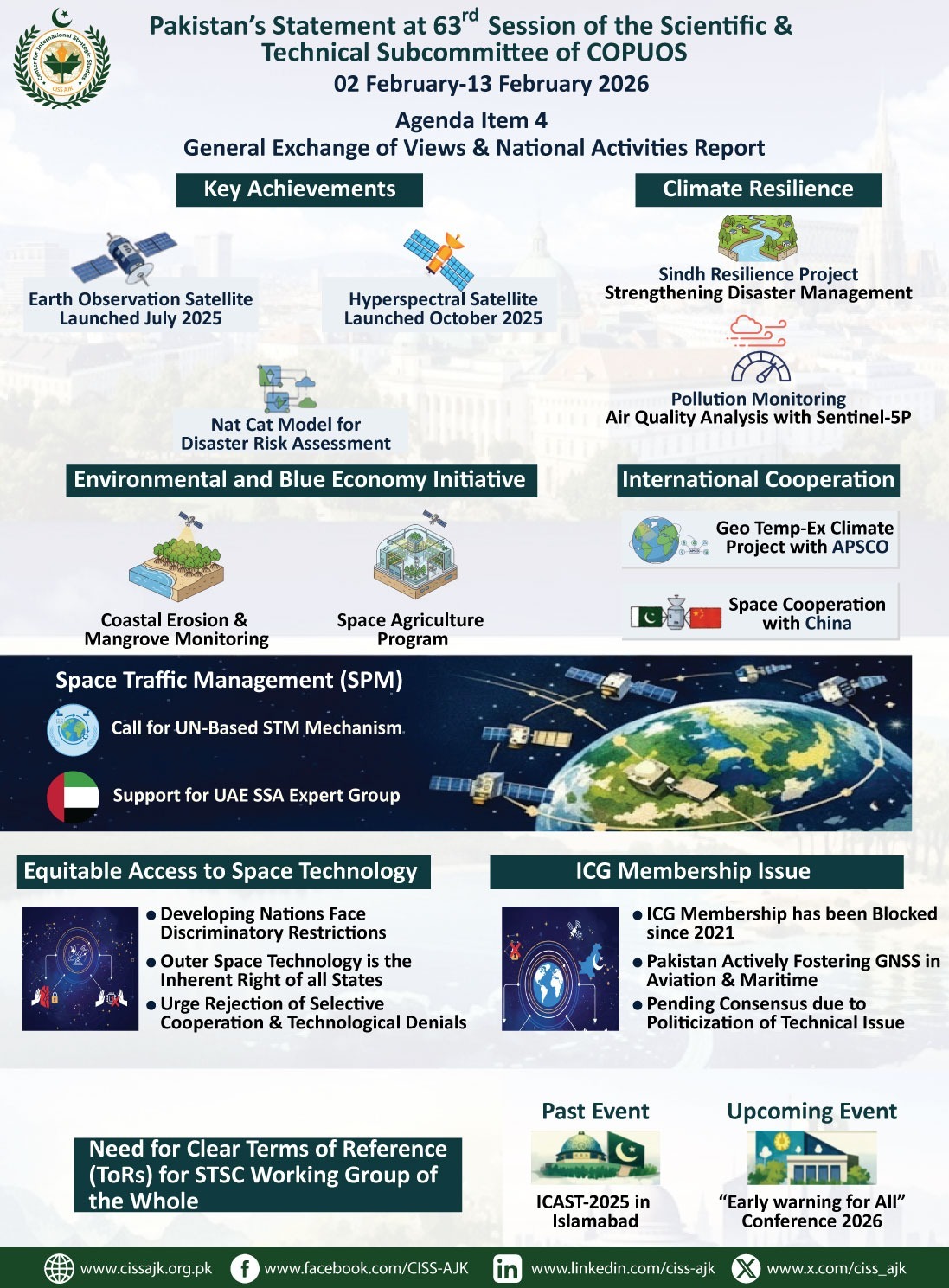 The infographic represents Pakistan’s statement at the 63rd STSC session of COPUOS, highlighting key achievements, climate initiatives, international cooperation, and its call for equitable and sustainable access to space technology for all.