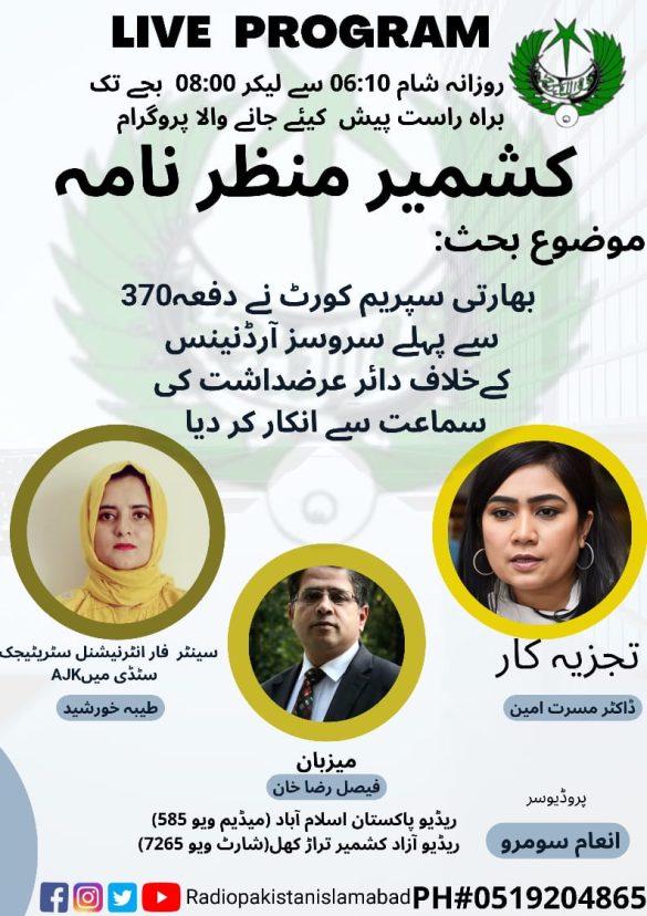 On 24th July, 2023, ARO Tayyaba Khurshid went live on Radio Pakistan Show ” Kashmir Manzar Nama” to share her views regarding petition in the supreme court against Revocation of Article 370 and 35A.