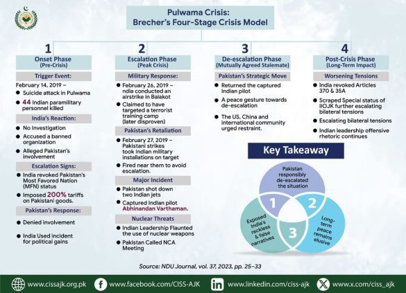 This infographic illustrates the Pulwama-Balakot Crisis through Brecher’s Four-Stage Crisis Model. It outlines the progression from the onset phase, marked by the February 14, 2019, attack in Pulwama, to the post-crisis phase characterized by long-term bilateral tensions. Key events include India’s airstrike in Balakot, Pakistan’s retaliatory response, and the subsequent de-escalation initiated by Pakistan’s return of a captured Indian pilot.
