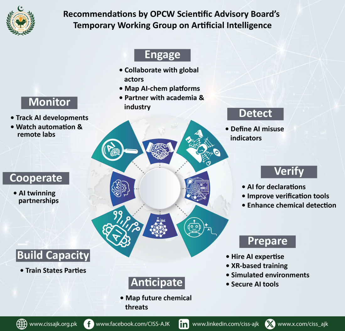 This infographic presents the 16 key recommendations of the Organisation for the Prohibition of Chemical Weapons Scientific Advisory Board’s Temporary Working Group on AI. It shows how the OPCW plans to monitor AI developments, detect misuse, enhance verification, build capacity, and foster global cooperation to prevent chemical weapons risks.