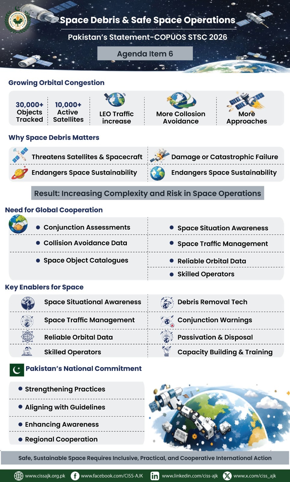 The infographic represents Pakistan’s statement at COPUOS STSC 2026 on Space Debris and Safe Space Operations, highlighting rising orbital congestion, associated risks, the need for global cooperation, key technical enablers, and Pakistan’s commitment to sustainable and responsible space practices.