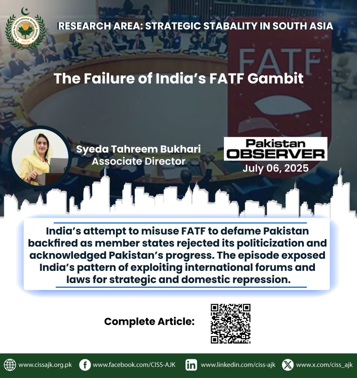 Desperate to malign Pakistan following the May 2025 escalation, New Delhi returned with another attempt to control narratives, this time by hijacking the mandate of the Financial Action Task Force (FATF). The case study highlighted was not only unfounded but also exposed India’s obsession to exploit the objectives of international institutions for strategic purposes.